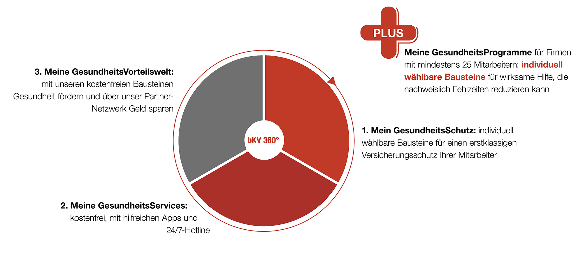 Stellen Sie Ihr Gesundheitskonzept zusammen, so wie es zu Ihrem Unternehmen und Ihren Mitarbeitern passt: bKV 360° bietet den passgenauen Rundumschutz. Bringen Sie Ihre Mitarbeiter damit in den Status eines Privatversicherten.