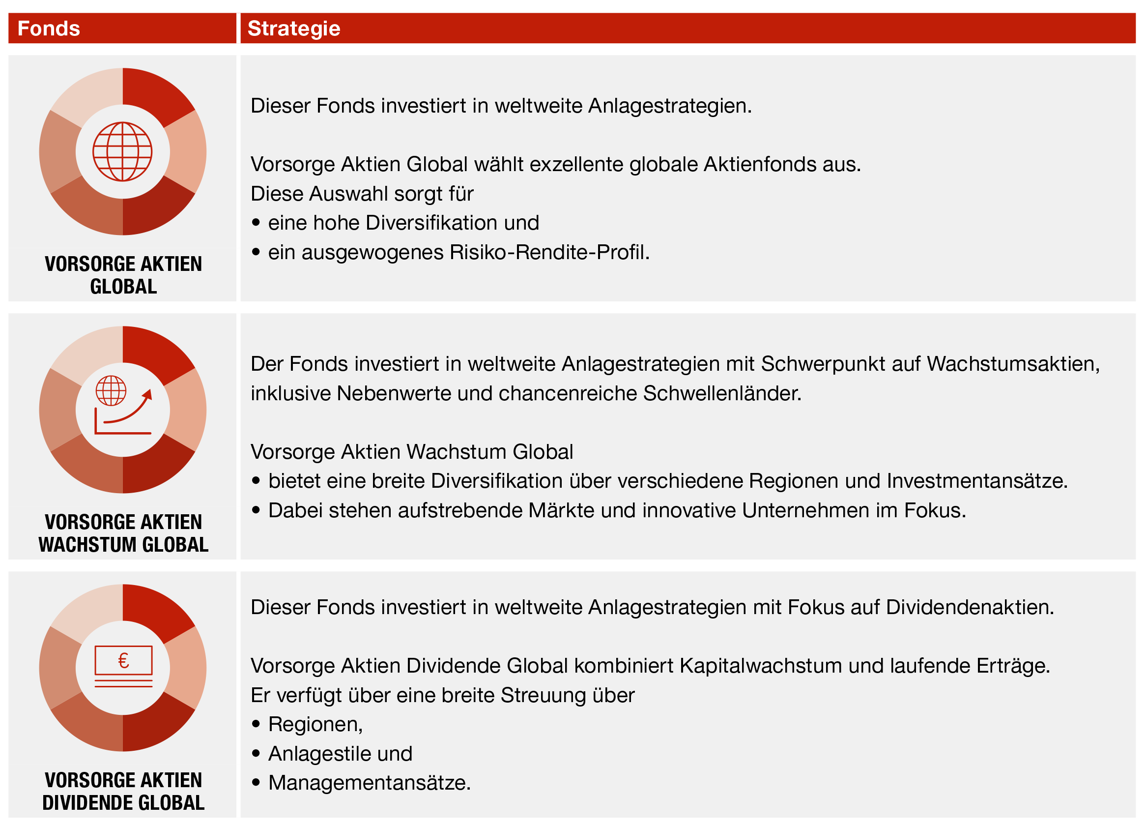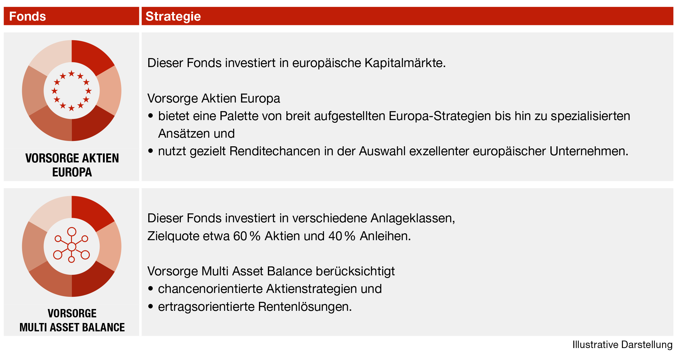 Für eine mögliche zusätzliche Fondsanlage bieten wir Ihren Mitarbeitern eine hochwertige Auswahl an Fonds mit unterschiedlichen Anlagemöglichkeiten. Beispielsweise Portfolio-Strategien, die es ausschließlich bei der Generali Deutschland Lebensversicherung gibt – Meritum Vorsorge-Familie.