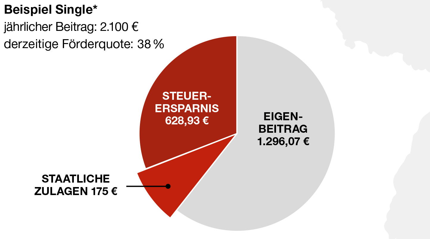 Er unterstützt Sie durch Zulagen und Steuervorteile. Sie erhalten die maximale Förderung, wenn Sie jährlich 4 % Ihres Vorjahres-Bruttoeinkommens in Ihren Vertrag einzahlen. Dieser Betrag entspricht Ihrem Eigenbeitrag und den staatlichen Zulagen. Zusätzlich können Sie Steuern sparen. Als Sonderausgaben können Sie bis zu 2.100 €/2.160 € im Jahr steuerlich absetzen.