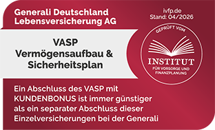 Das Institut für Vorsorge und Finanzplanung kommt nach intensiven Berechnungen zu dem Ergebnis, dass der Abschluss eines VASP mit KUNDENBONUS immer günstiger ist als ein separater Abschluss dieser Einzelversicherungen bei der Generali. Weitere Informationen zu diesem Siegel finden Sie hier.