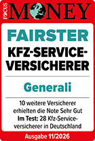 FOCUS-MONEY zeichnet die Generali zum Fairsten Kfz-Versicherer 2026 aus. Zur Ermittlung der Fairness wurden faires Produktangebot, Preis-Leistungsverhältnis, Kundenservice, Kundenkommunikation, Kundenberatung und Schadenregulierung aus Kundenurteilen bewertet. Hier erfahren Sie mehr: Kundenurteil: Fairness von Kfz-Versicherern 2026 - ServiceValue